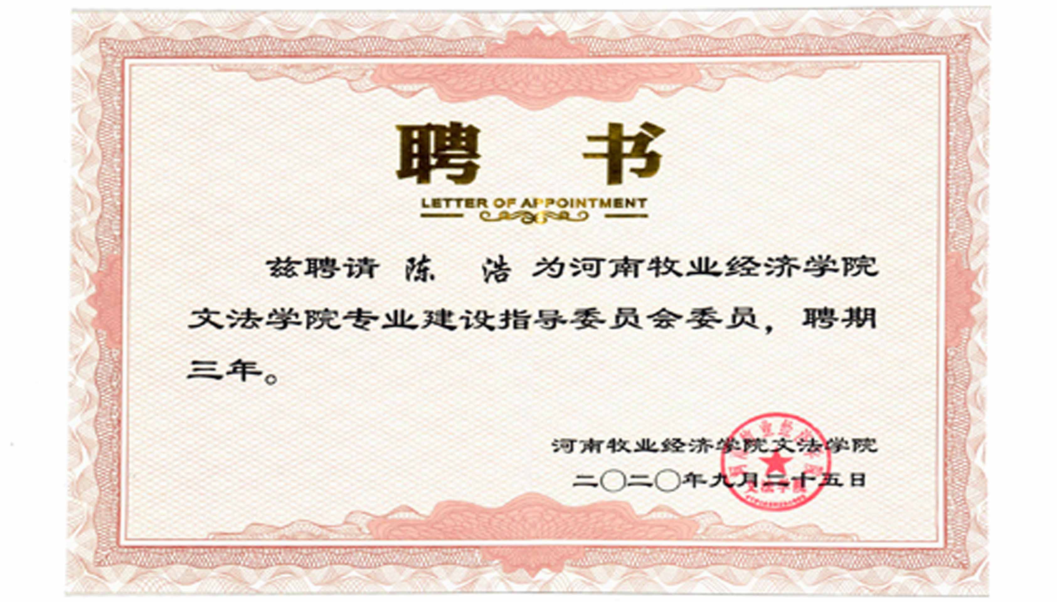 公司總經(jīng)理陳浩被河南牧業(yè)經(jīng)濟(jì)學(xué)院(文法學(xué)院)聘為專業(yè)建設(shè)指導(dǎo)委員會會員。