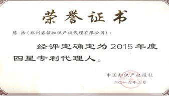 2016年3月公司陳浩總經(jīng)理被評為“2016年度四星專利代理人”。 -