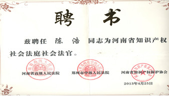 2013年4月公司總經(jīng)理陳浩被聘任為“河南省知識產(chǎn)權(quán)社會法庭社會法官”。