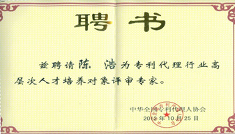 2012年12月公司總經(jīng)理陳浩被聘為“專利代理行業(yè)高層次人才培養(yǎng)對象評審專家”。 -