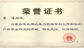 2010年1月公司總經(jīng)理陳浩獲專利工作和知識產(chǎn)權(quán)事業(yè)作出貢獻的表彰證書。