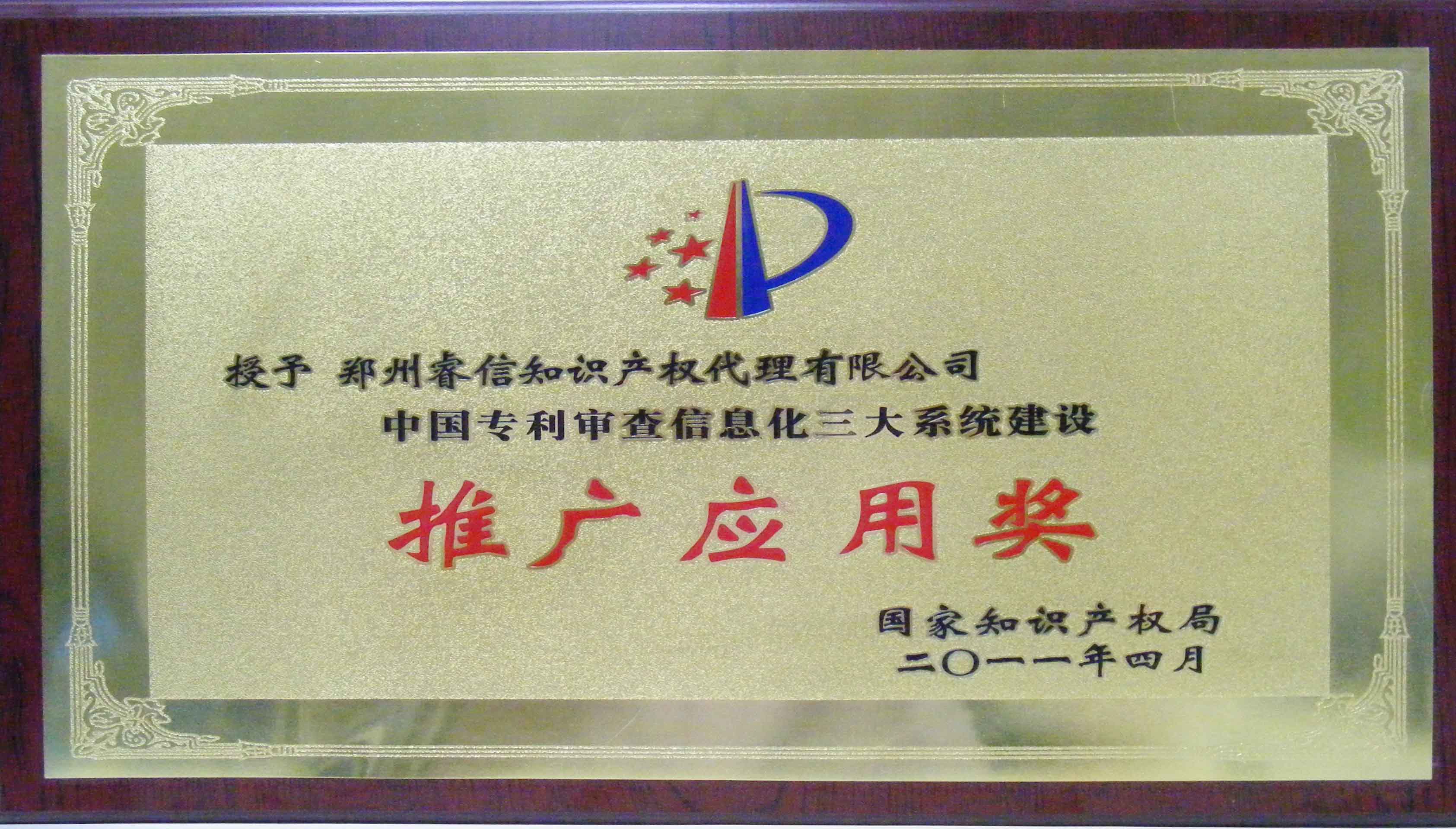 2011年4月公司被國家知識產(chǎn)權(quán)局授予中國專利審查信息化三大系統(tǒng)建設(shè)推廣應(yīng)用獎。