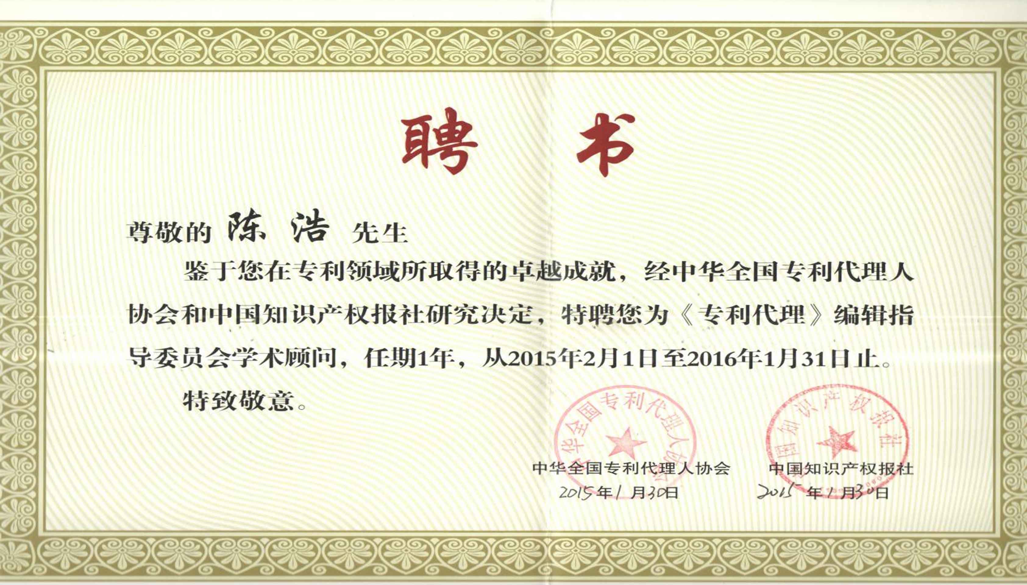 2015年1月公司總經(jīng)理陳浩受聘擔(dān)任《專利代理》雜志學(xué)術(shù)顧問。