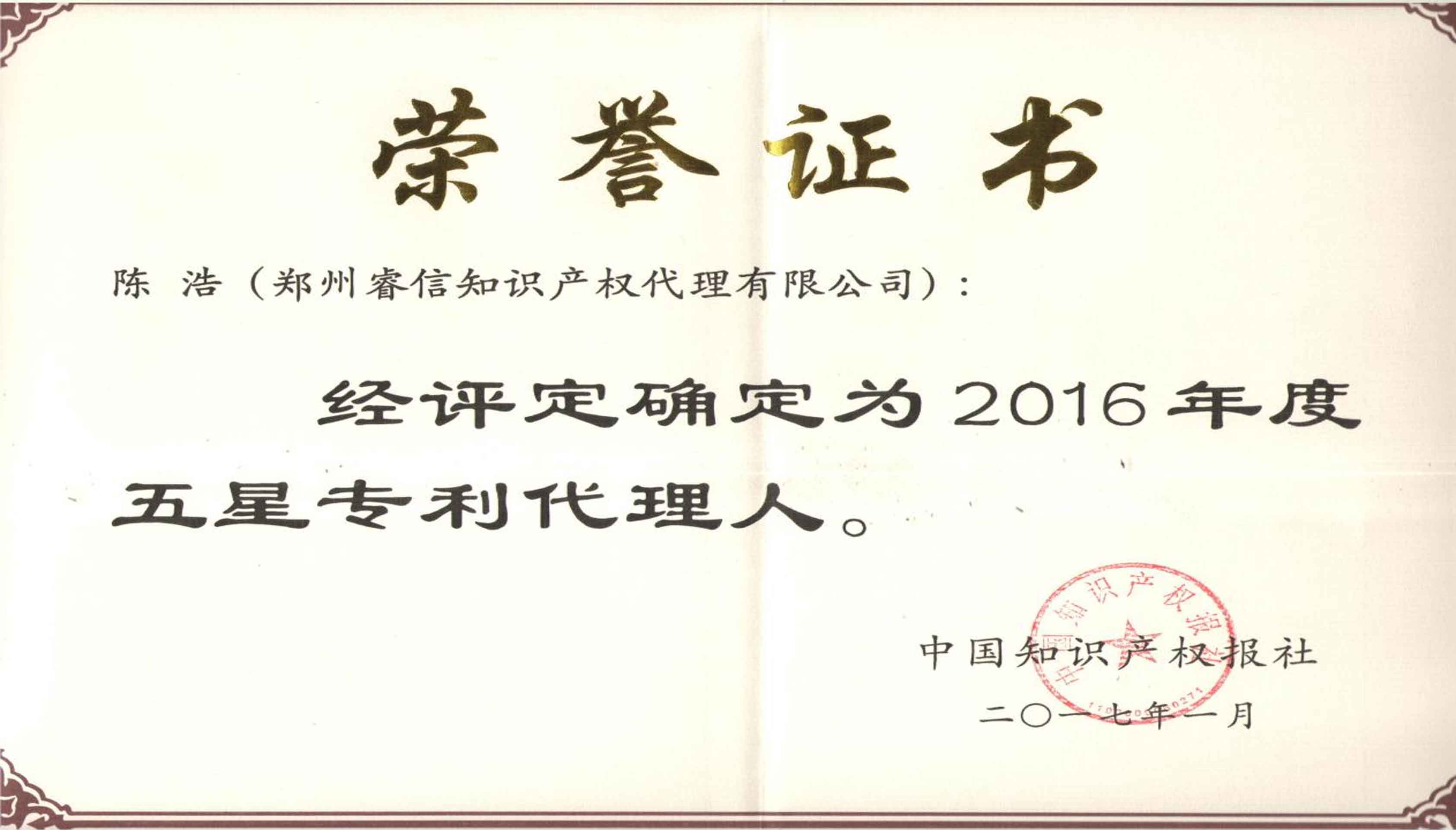2017年1月公司陳浩總經(jīng)理被評為“2016年度五星專利代理人”。 -