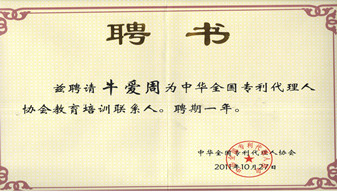 2011年10月公司代理人被聘為中華全國專利代理人協(xié)會教育培訓聯(lián)系人。