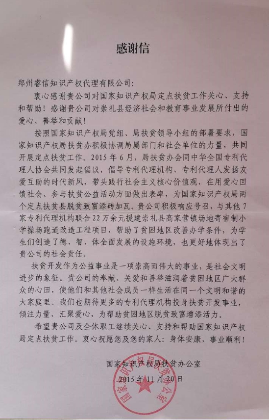 今年,協(xié)會(huì)首次開(kāi)展了行業(yè)扶貧公益活動(dòng),在承接的2個(gè)扶貧項(xiàng)目中,得到了多家專利代理機(jī)構(gòu)的積極響應(yīng)和支持。最終由北京柳沈律師事務(wù)所、中國(guó)國(guó)際貿(mào)易促進(jìn)委員會(huì)專利商標(biāo)事務(wù)所、鄭州睿信知識(shí)產(chǎn)權(quán)代理有限公司、北京三友知識(shí)產(chǎn)權(quán)有限公司、廣州華進(jìn)聯(lián)合專利商標(biāo)代理有限公司等9家代理機(jī)構(gòu)出資捐助完成。