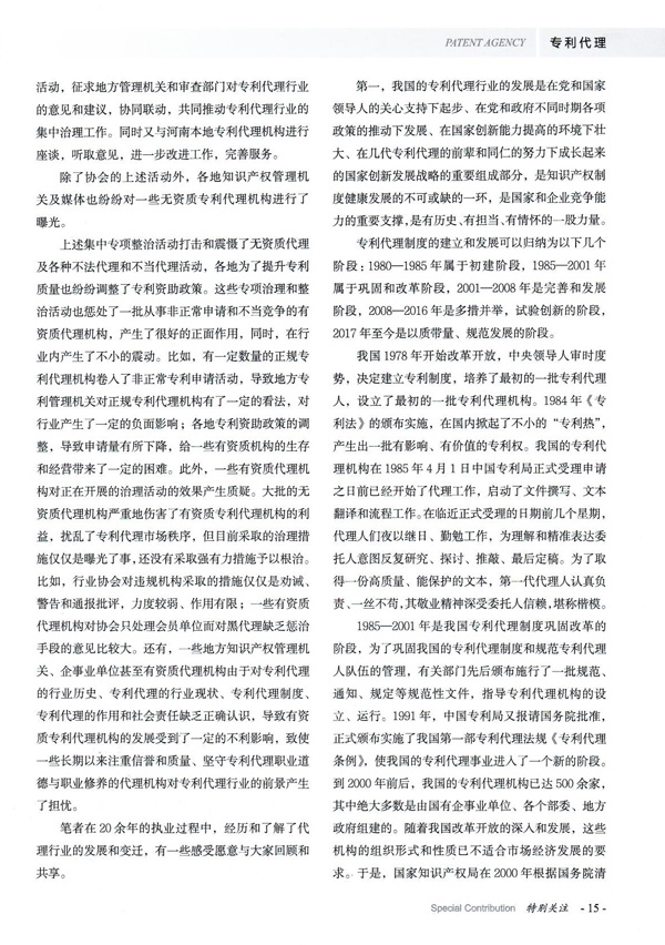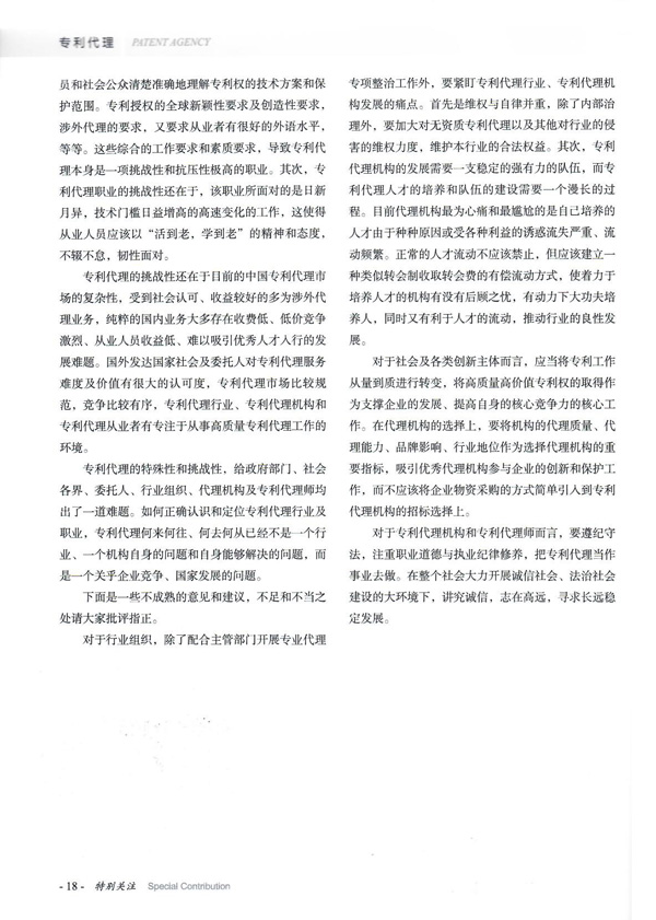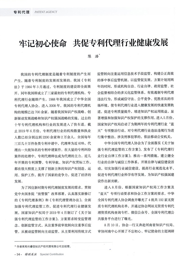 陳浩——鄭州睿信知識產(chǎn)權(quán)代理有限公司總經(jīng)理,是中華全國專利代理人協(xié)會第九屆副會長,現(xiàn)任中華全國專利代理人協(xié)會第十屆副會長。陳總是全國知識產(chǎn)權(quán)行業(yè)領(lǐng)軍人才,國家知識產(chǎn)權(quán)專家?guī)鞂<?,全國五星級專利代理人,工業(yè)和信息化領(lǐng)域知識產(chǎn)權(quán)專家,從事專利代理24年,見證了代理行業(yè)的發(fā)展和變遷。陳總用獨特的視角,通過對不同時期我國專利代理制度的介紹,談專利代理行業(yè)的初心和使命。專利代理行業(yè)的特殊性在于其社會責(zé)任性,專利代理之于創(chuàng)新主體、之于政府和管理部門都有著重要的作用。如何正確認識和定位專利代理行業(yè)及職業(yè),專利代理何去何從已經(jīng)不是一個行業(yè)、一個機構(gòu)自身的問題和自身能夠解決的問題,而是一個關(guān)乎企業(yè)競爭、國家發(fā)展的問題。陳總并就專利代理行業(yè)發(fā)展面臨的問題提出了頗有見地的解決辦法。