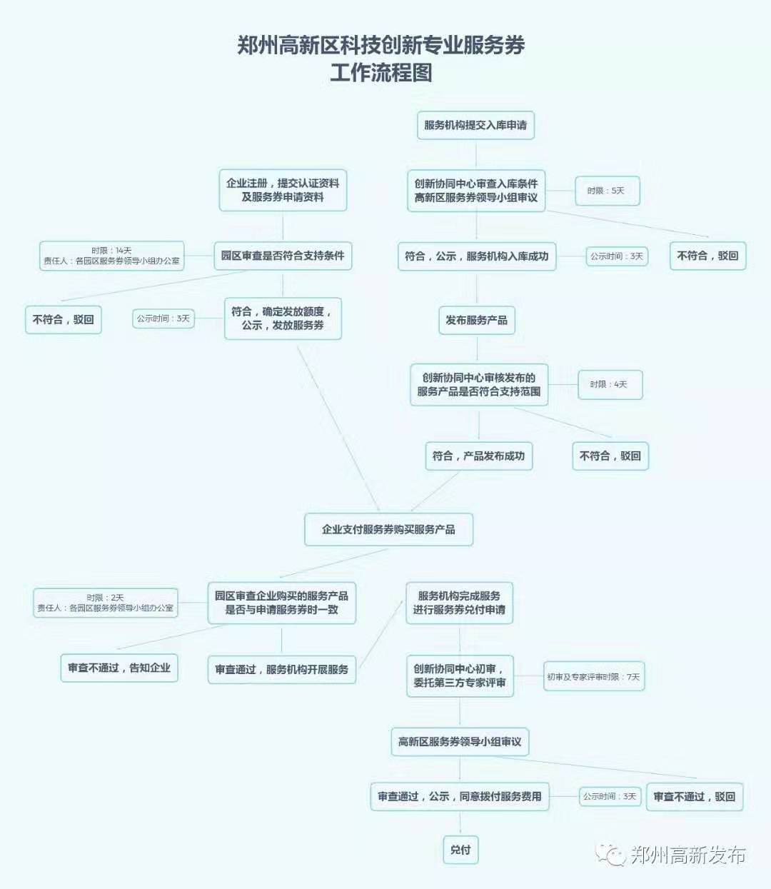 為做好這項(xiàng)工作,高新區(qū)創(chuàng)新發(fā)展局牽頭各相關(guān)單位,先后召開專題研究會(huì)議30余次,出臺(tái)了《鄭州高新技術(shù)產(chǎn)業(yè)開發(fā)區(qū)科技創(chuàng)新專業(yè)服務(wù)券管理暫行辦法(試行)》和3個(gè)實(shí)施細(xì)則(《鄭州高新技術(shù)產(chǎn)業(yè)開發(fā)區(qū)科技創(chuàng)新專業(yè)服務(wù)券受理審核發(fā)放實(shí)施細(xì)則(試行)》、《鄭州高新技術(shù)產(chǎn)業(yè)開發(fā)區(qū)科技創(chuàng)新專業(yè)服務(wù)券服務(wù)機(jī)構(gòu)入庫管理細(xì)則(試行)》、《鄭州高新技術(shù)產(chǎn)業(yè)開發(fā)區(qū)科技創(chuàng)新專業(yè)服務(wù)券兌付實(shí)施細(xì)則(試行)》),制定了從申請(qǐng)、發(fā)放、使用到兌付的較為科學(xué)、可操作性強(qiáng)的工作流程圖。